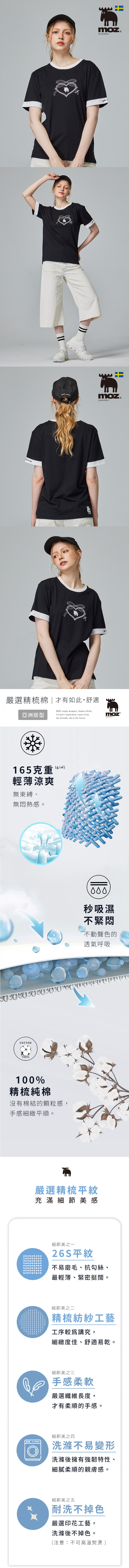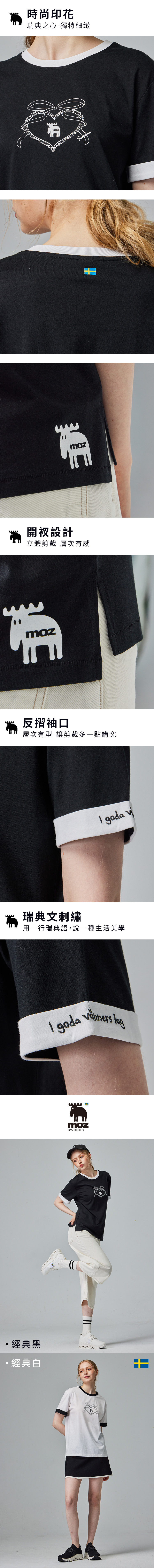 moz瑞典 駝鹿 瑞典之心 舒適柔棉 100%純棉短T-袖口反摺刺繡-經典黑(亞洲版)女款