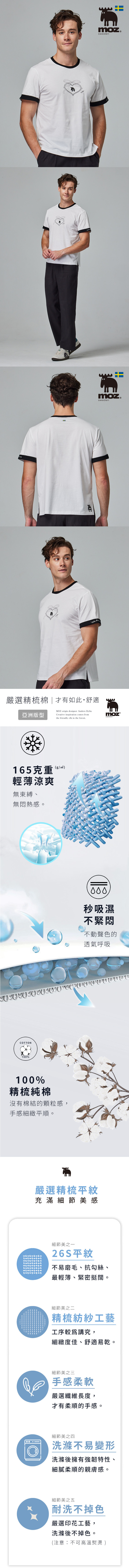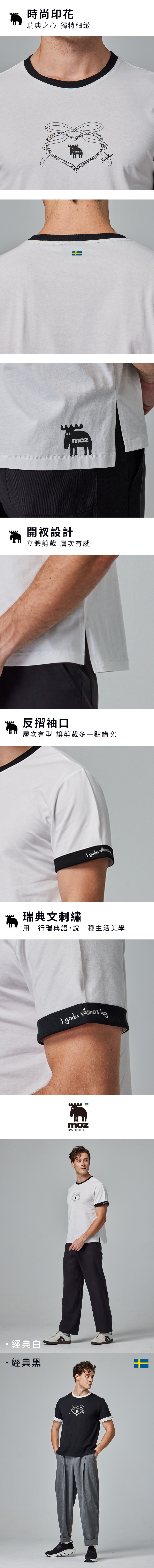moz瑞典 駝鹿 瑞典之心 舒適柔棉 100%純棉短T-袖口反摺刺繡-經典白(亞洲版)男款