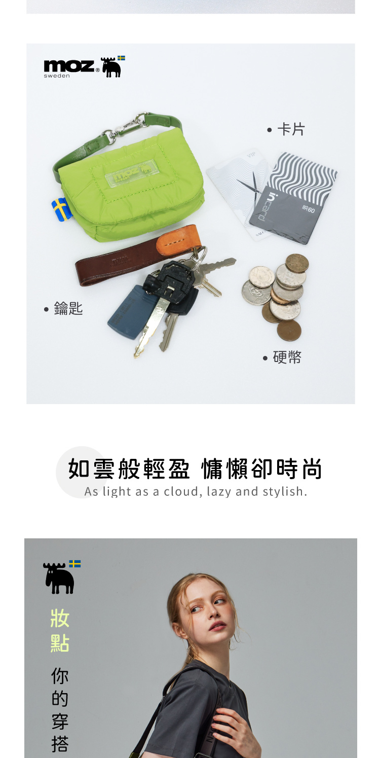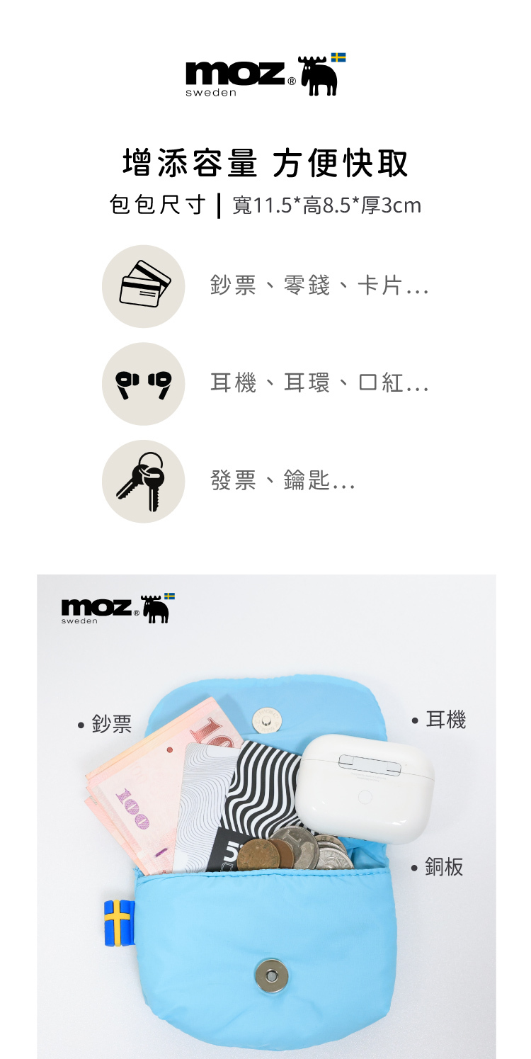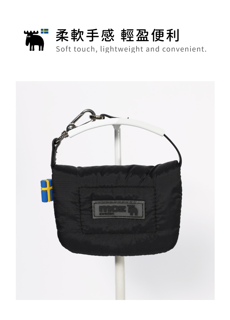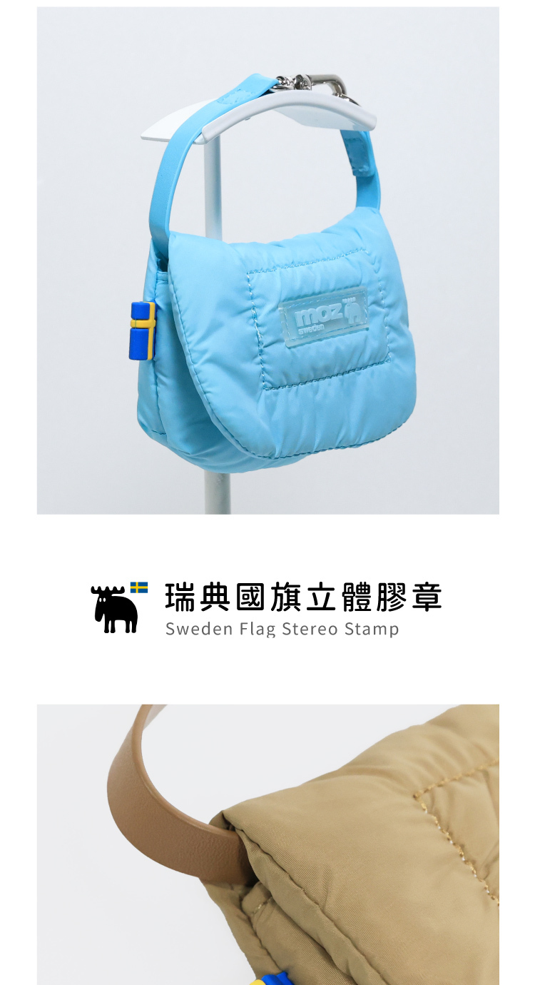 moz駝鹿Logo與瑞典國旗膠章,小包也能展現品牌風格與北歐設計感。