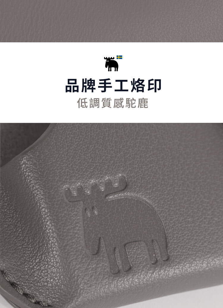 專屬品牌駝鹿 LOGO手工烙印於皮革,展現質感細節。
