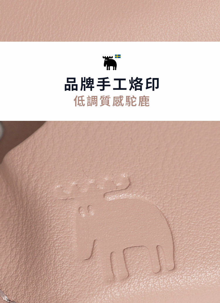 專屬品牌駝鹿 LOGO手工烙印於皮革,展現質感細節。