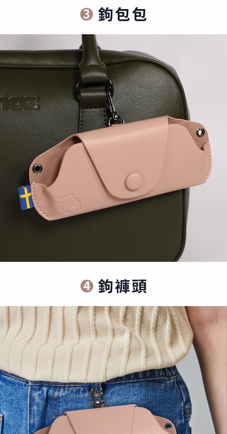 A:除了放眼鏡,也能作為隨身小物收納袋。可用金屬掛勾掛在包包上,或搭配背帶,出門攜帶更便利。