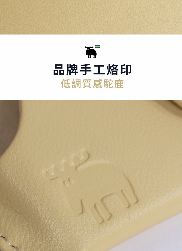 專屬品牌駝鹿 LOGO手工烙印於皮革,展現質感細節。