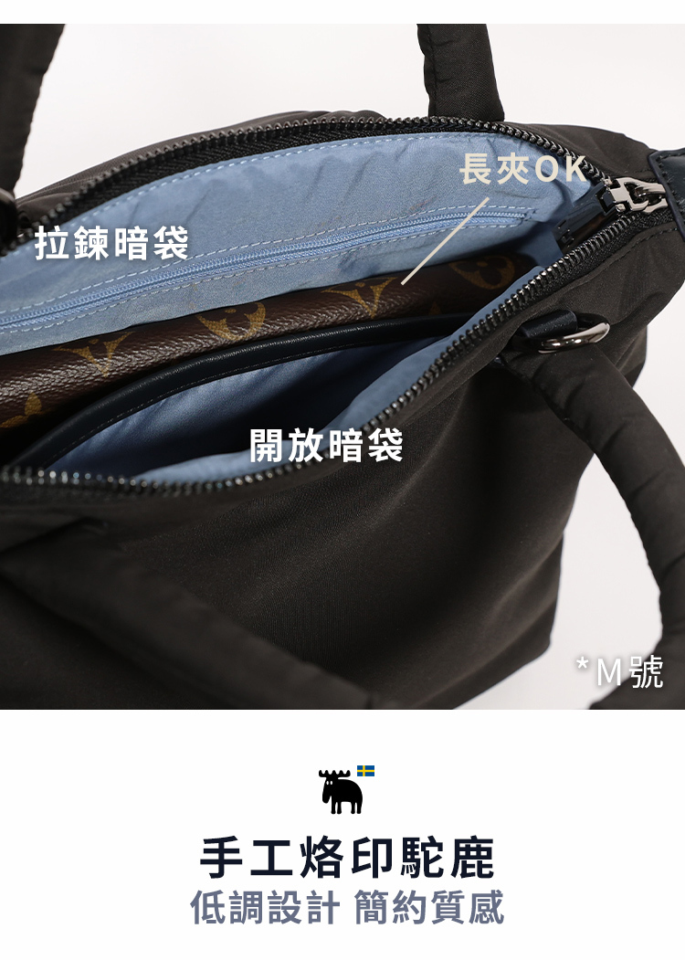 | A:M號容量放大升級!能輕鬆收納長夾、A5文件等日常必需品,內裡設有雙暗袋,分類收納也很方便。 |