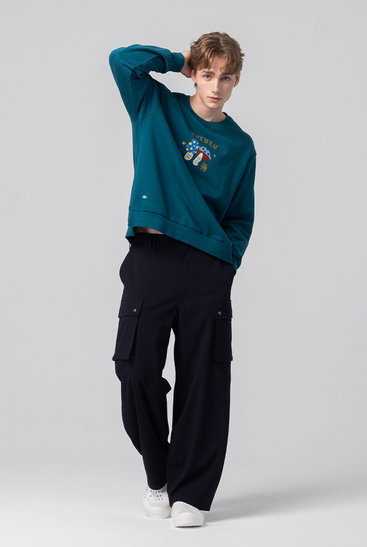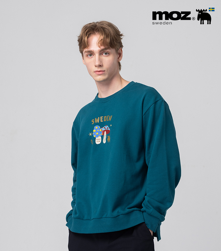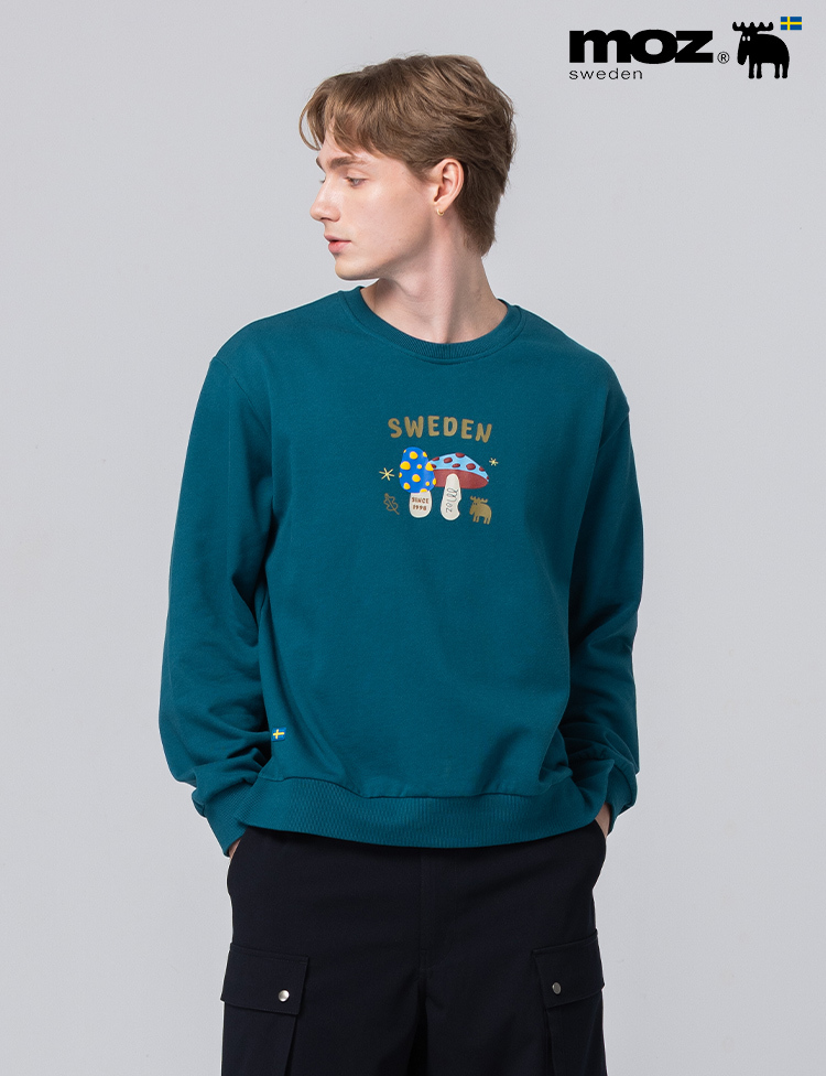 立體發泡 駝鹿蘑菇咬一口 100%純棉 開衩大學T-墨藍綠(亞洲版) 開衩 男款