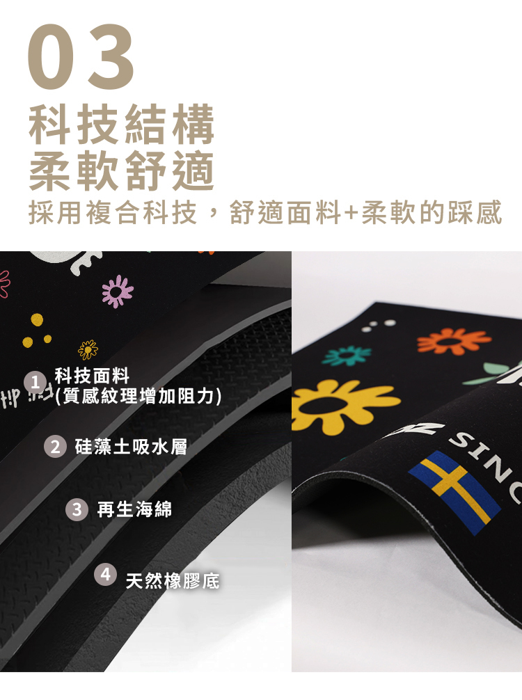 地墊採 四層結構設計,兼顧吸水、耐用與止滑效果。