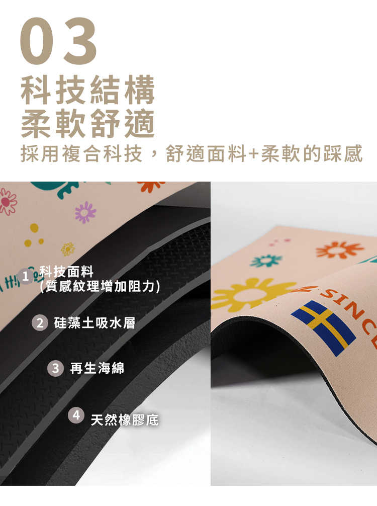 地墊採 四層結構設計,兼顧吸水、耐用與止滑效果。