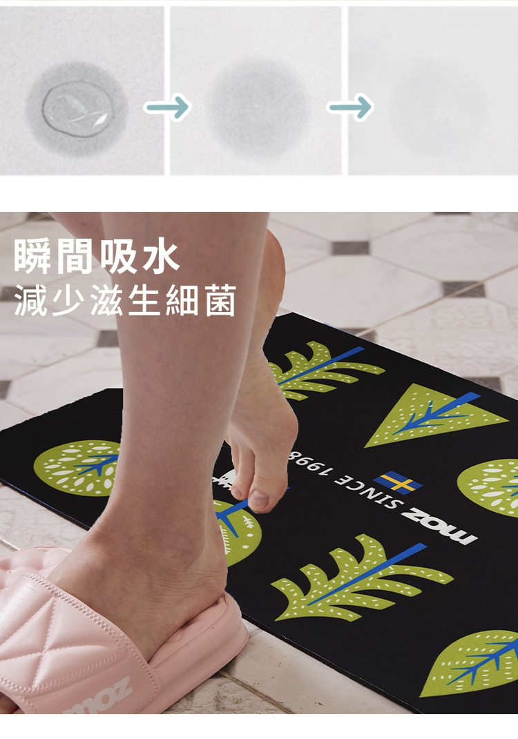 採用 軟硅藻吸水材質,吸水速度快,能迅速帶走腳底水分,維持乾爽不黏腳。相較傳統硬式硅藻地墊,腳感更柔軟,長時間使用也更舒適。