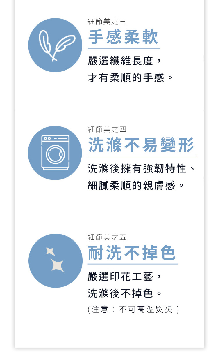 避免破壞布料,勿使用漂白劑、螢光增白劑及衣物柔軟劑