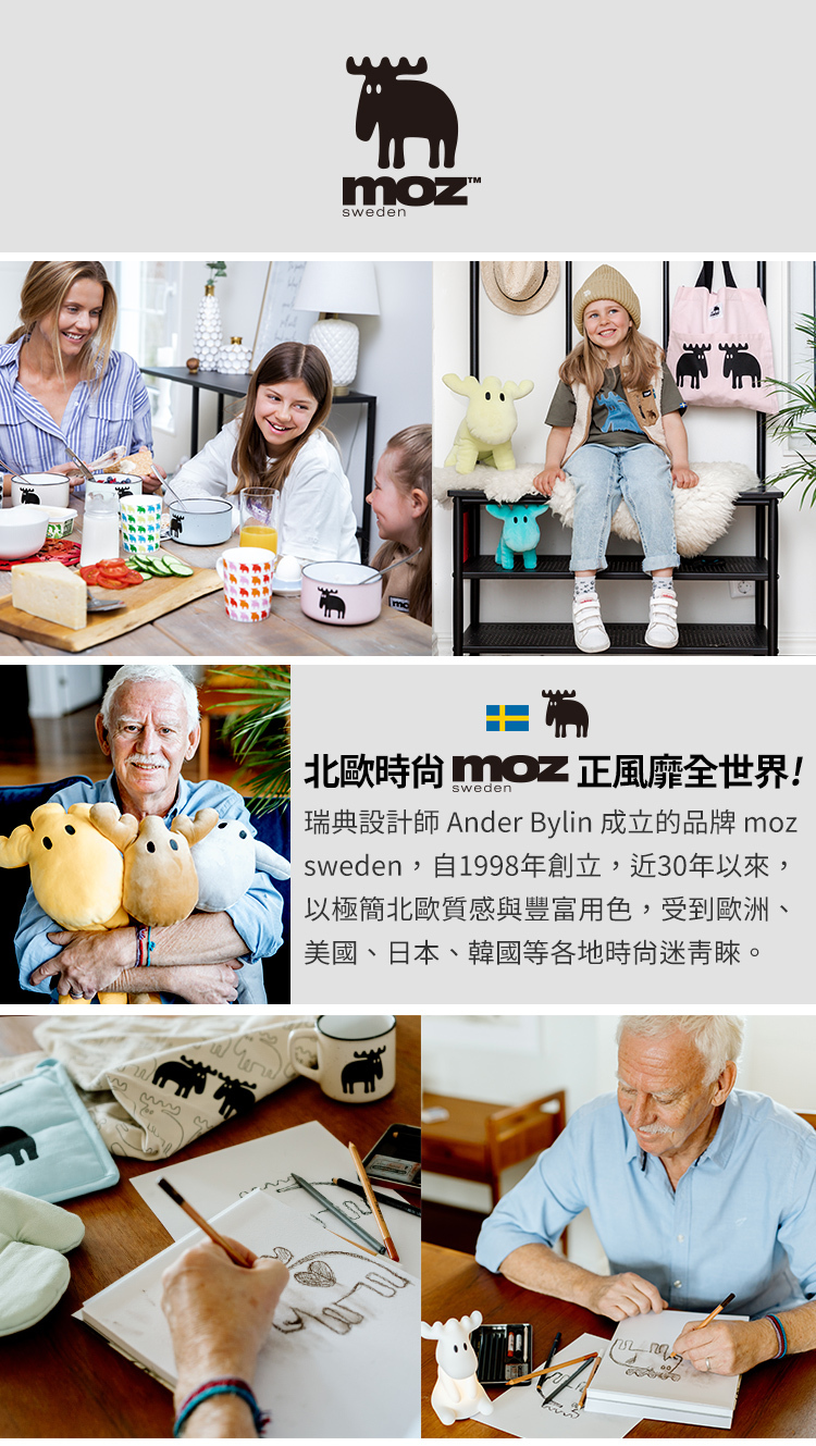 來自北歐的家居設計品牌 moz sweden , 起源自設計師Anders Bylin1986年創立的Färg&Form公司,主打親子雜貨商品,後來成功創造moz家居設計品牌,以來自瑞典森林的友善駝鹿為logo,充滿童趣純真的形象,深受年輕族群的喜愛。moz所有商品充分展現了簡約的北歐風格,駝鹿可愛質樸的造型加上繽紛色彩,實在讓人很難不被那萌萌的雙眼吸引,更因為簡約的設計搭上實用機能性,現在moz於歐美與日本、韓國等國家都相當受歡迎!