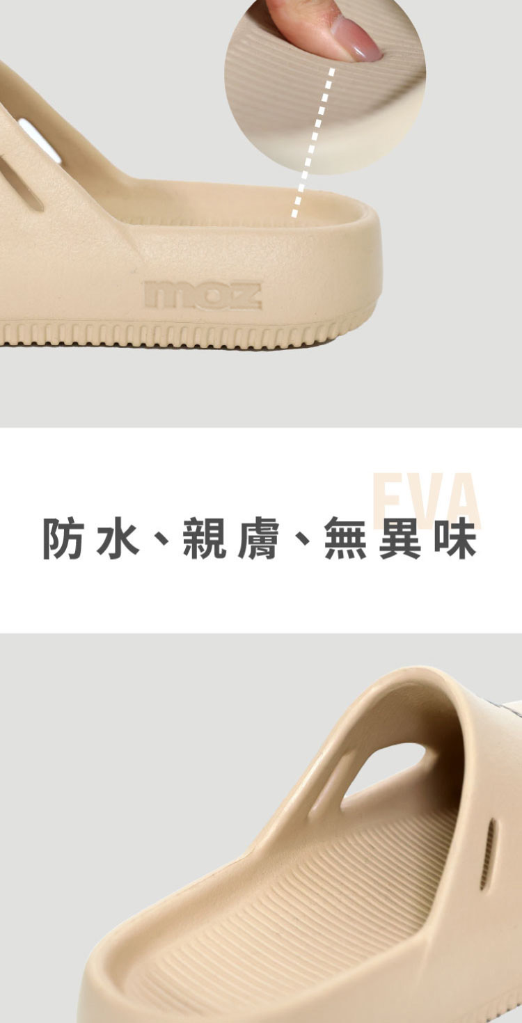 | A:使用高彈EVA材質製成,輕盈柔軟、舒適包覆,鞋面親膚不悶熱,適合長時間穿著。 |