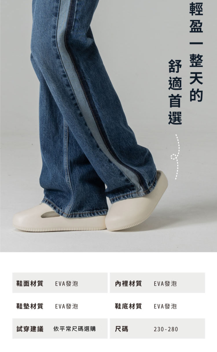 ※ 本產品採用高彈EVA材質製成,大量生產過程中因材質特性與製程可能出現些微痕跡或輕微色差,皆屬正常範圍,不影響產品使用或舒適性。