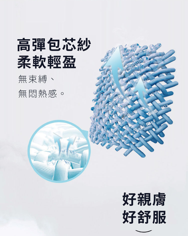 嚴選高彈包芯紗結構,擁有絕佳延展性與穩定回彈力,觸感細緻不緊繃,長時間穿著依然舒適輕盈。