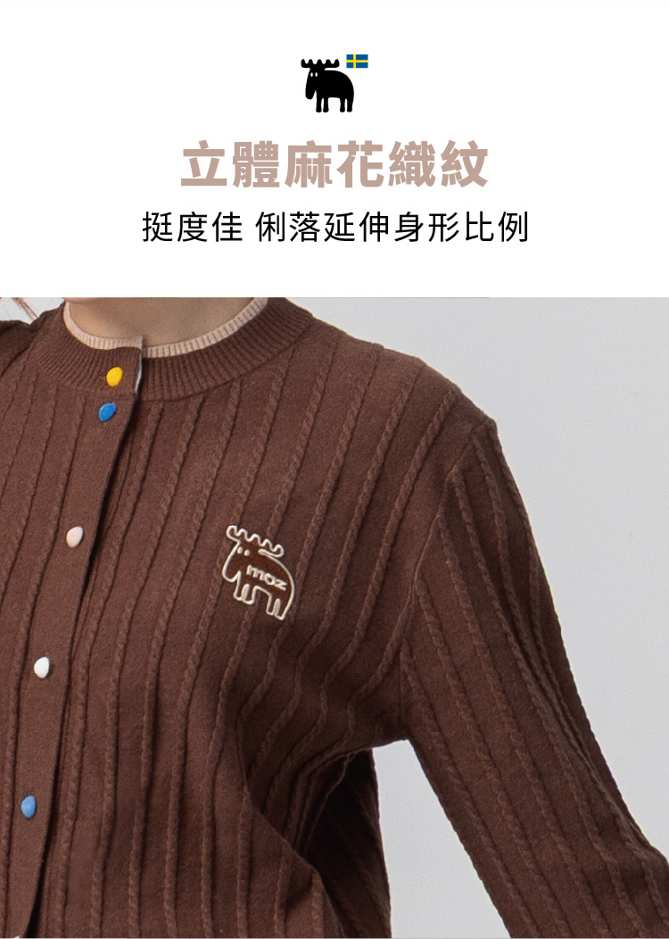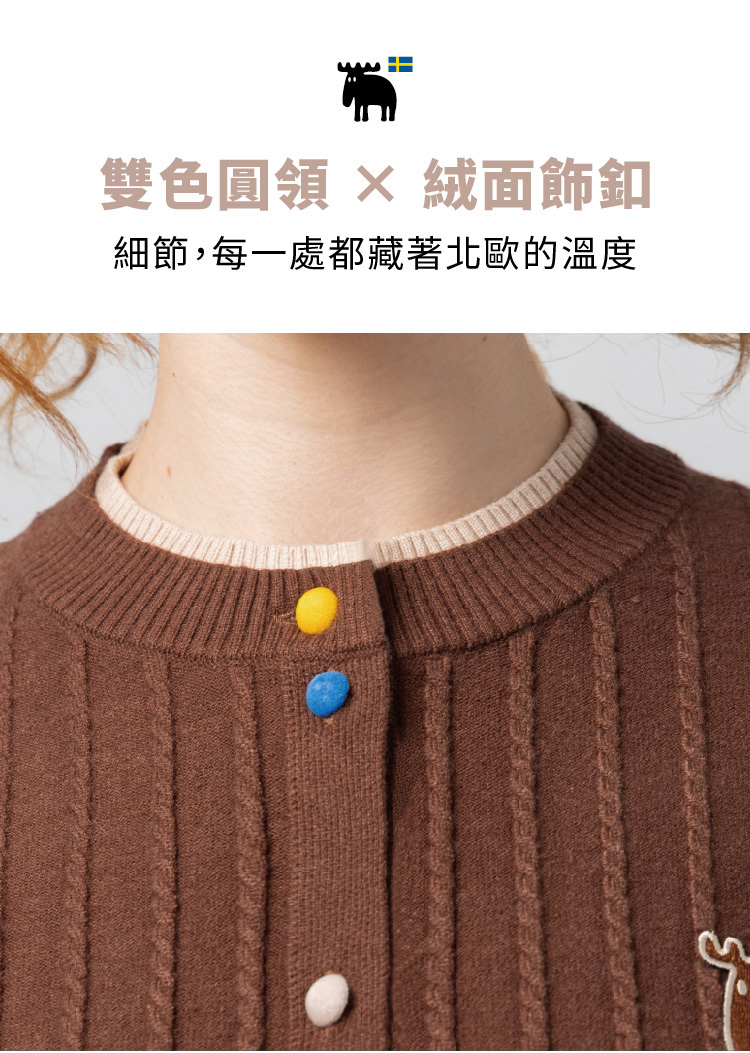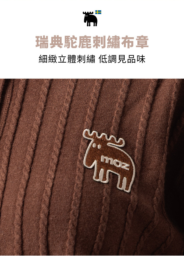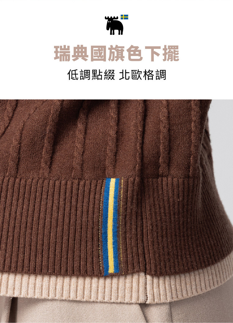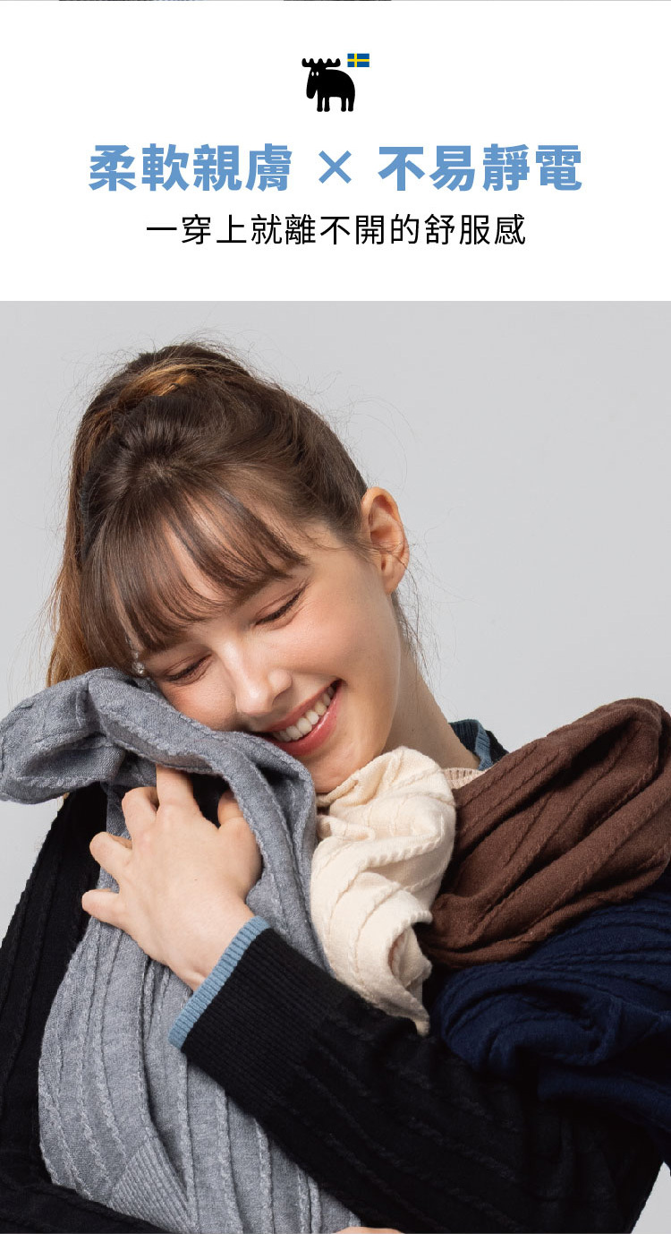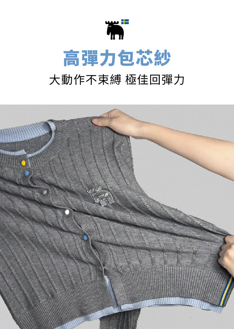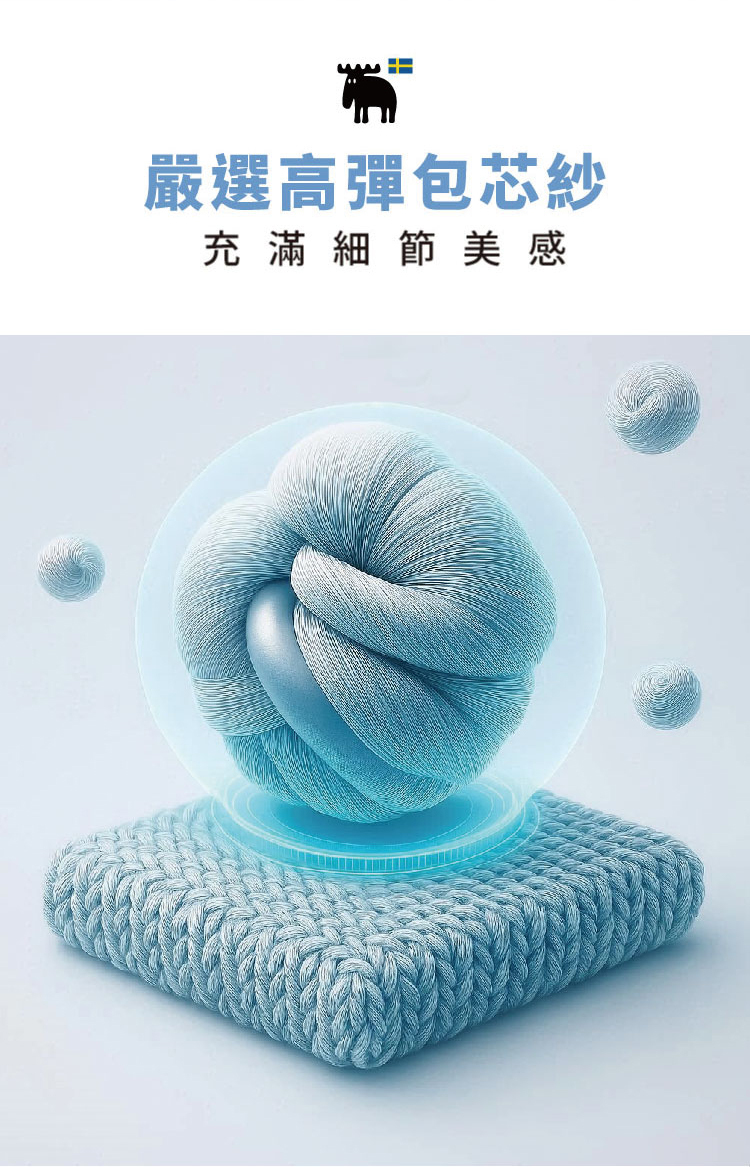 A:採用高彈包芯紗製成,柔軟親膚、彈性佳不緊繃。結合立體麻花織紋與瑞典國旗織紋設計,展現北歐簡約質感。