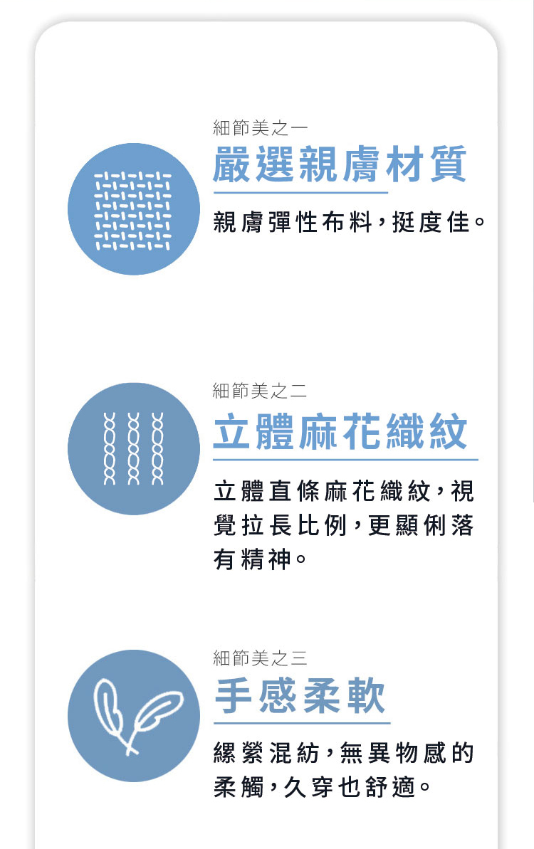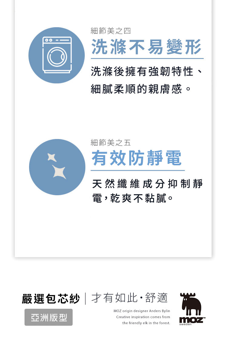 纖維細緻柔順、親膚不刺癢,布料支撐性佳、不易變形,經多次洗滌仍能保持平整挺度。