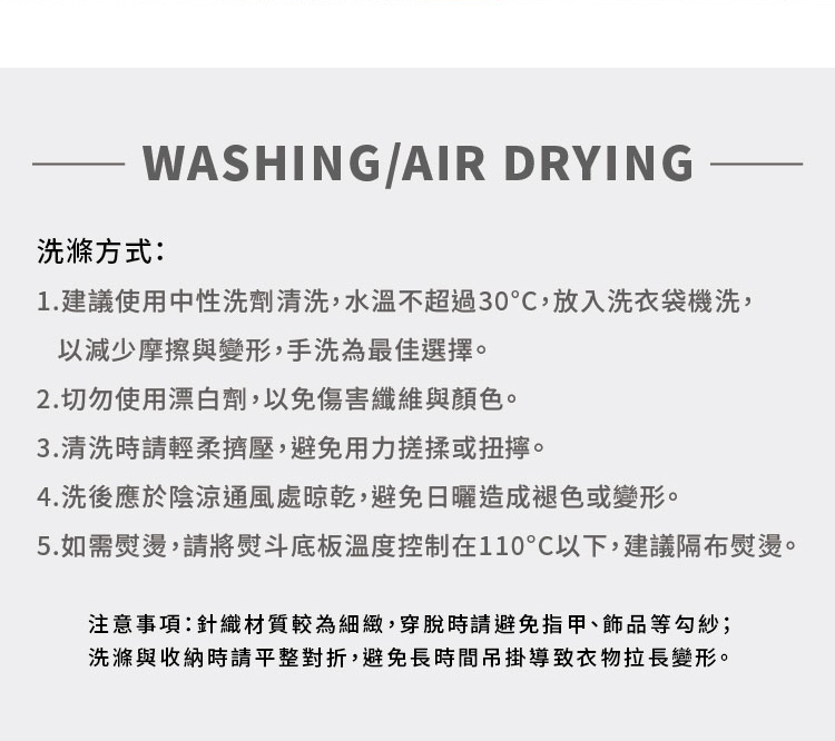 洗滌與收納時請平整對折,避免長時間吊掛導致衣物拉長變形。