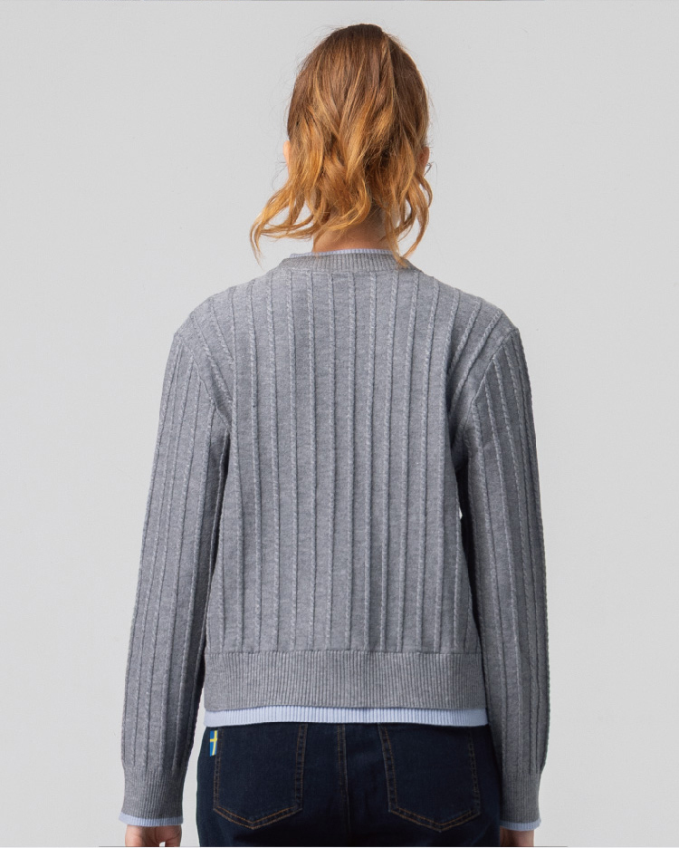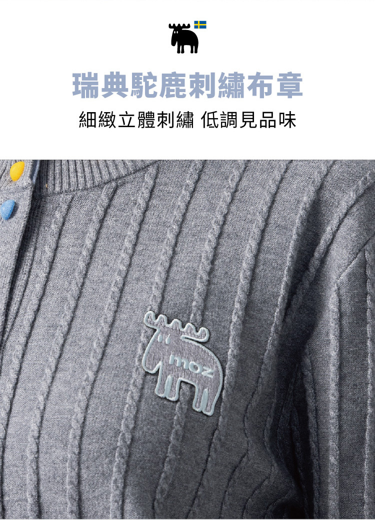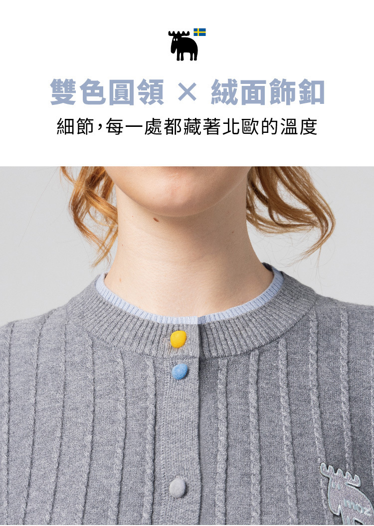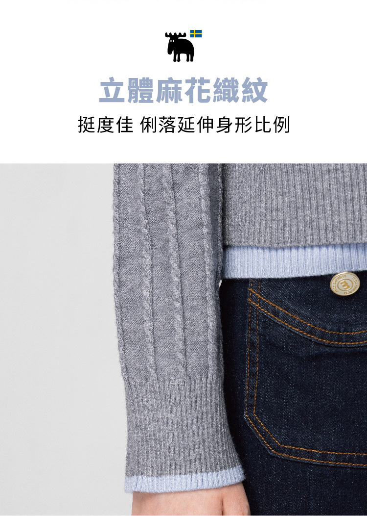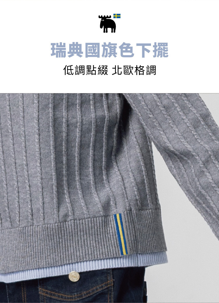A:採用高彈包芯紗製成,柔軟親膚、彈性佳不緊繃。結合立體麻花織紋與瑞典國旗織紋設計,展現北歐簡約質感。