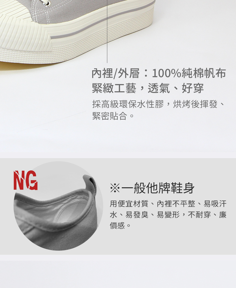 【內裡/外層:100%純棉帆布 緊緻工藝,透氣、好穿】採高級環保水性膠,烘烤後揮發、緊密貼合。