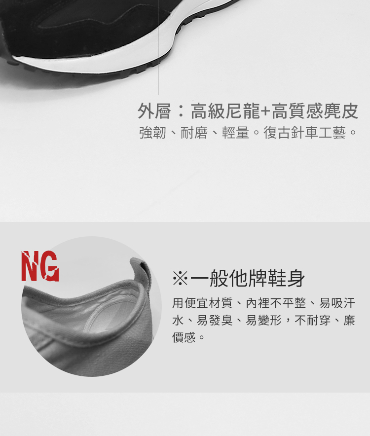 鞋身:尼龍+麂皮+泡棉+TRICOT+BK網布