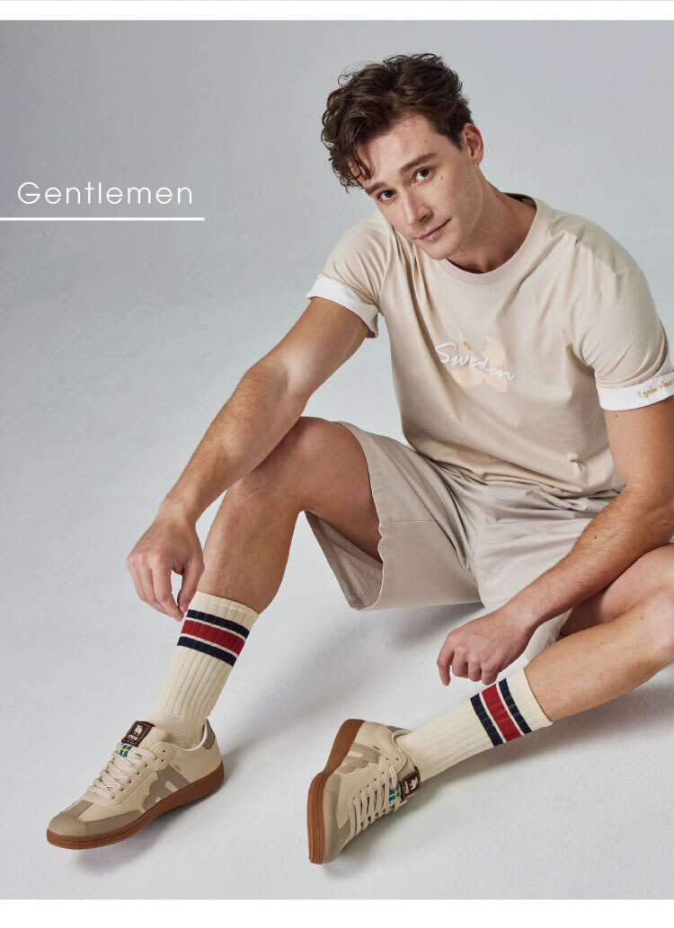 | A:可搭配牛仔褲、休閒褲或運動褲,展現復古運動風。配素色襪或短襪都很適合。 |