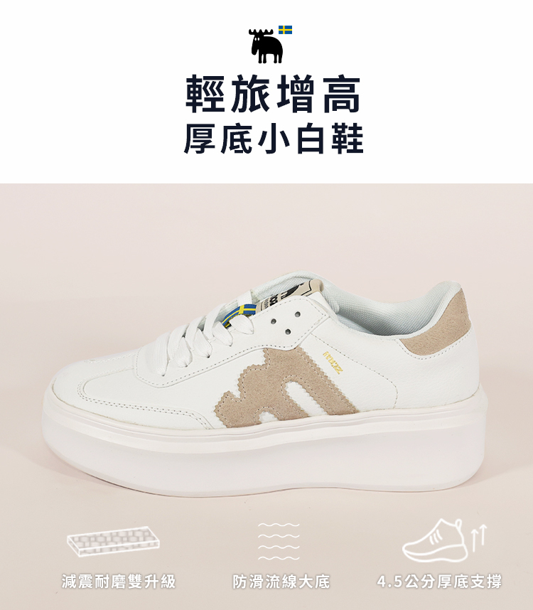 | A:這款小白鞋主打輕盈增高、舒適耐走。升級 4.5 公分厚底設計,結合防滑紋路與柔軟鞋墊,日常穿搭與旅遊行走都能維持舒適腳感。 |