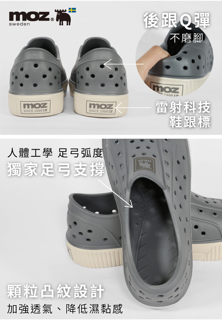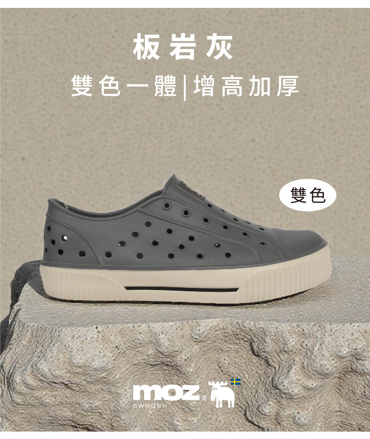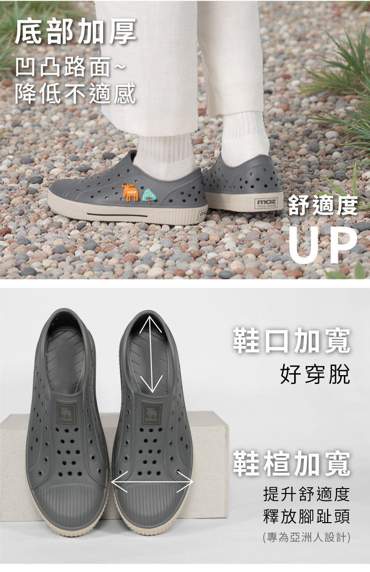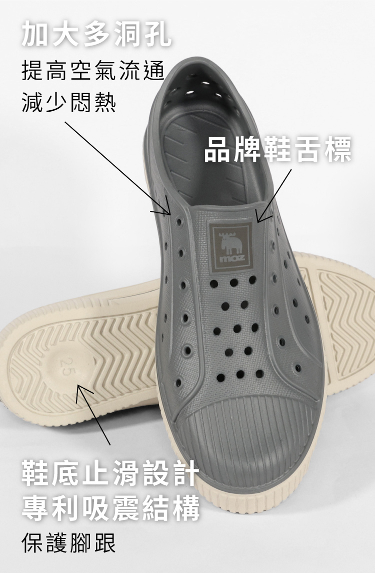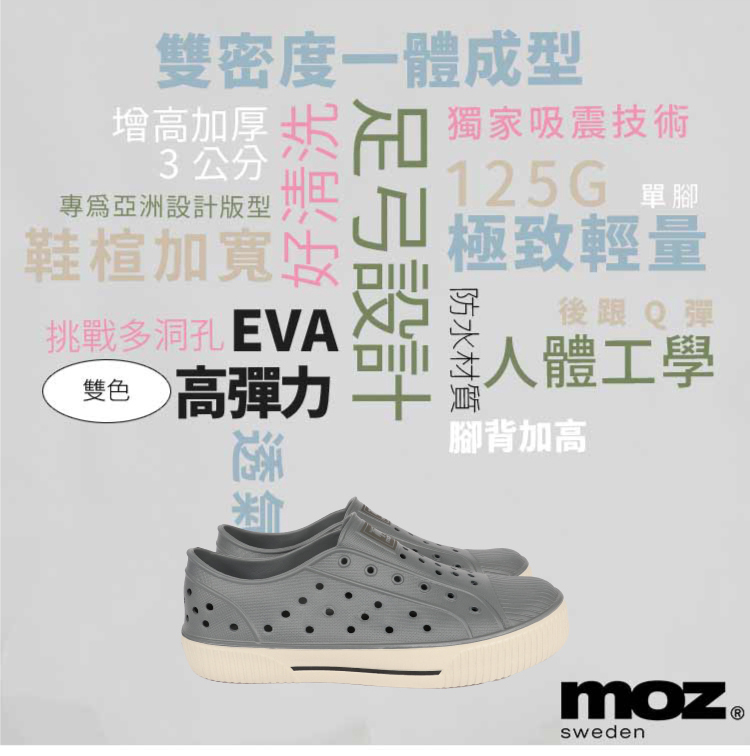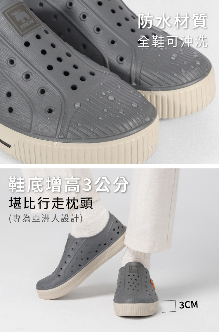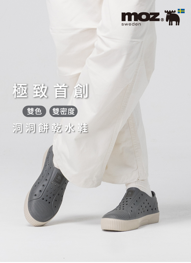 想找一雙既輕盈又舒適的洞洞水鞋?moz瑞典駝鹿全球首創「餅乾水鞋」,嚴選日本UBE無毒EVA原料,僅125g超輕量,就像一杯冰淇淋的重量。3cm增高設計拉長腿部比例,加寬鞋楦和Q彈後跟不磨腳,久站、久走都能安心舒適。加大透氣洞孔,夏天穿也涼爽不悶熱,適合日常外出或防水使用。