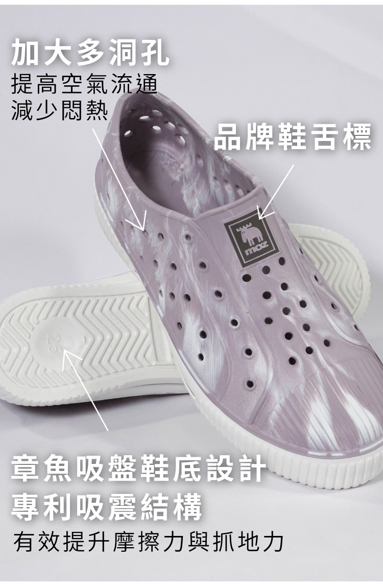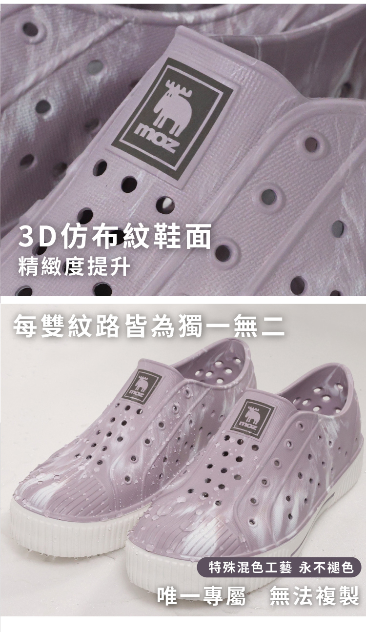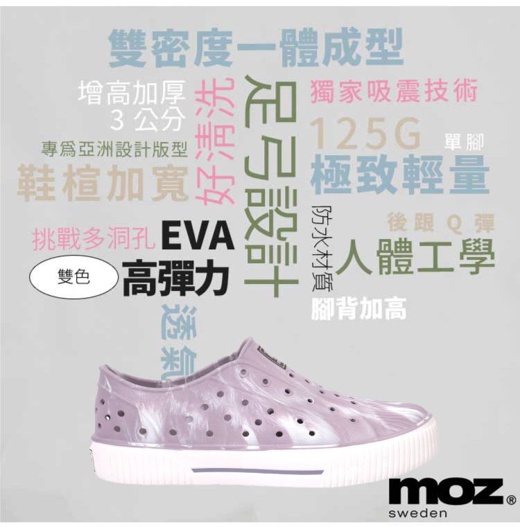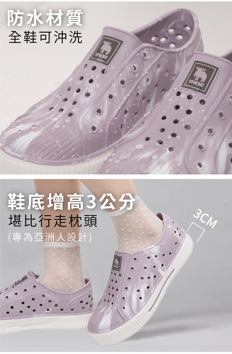 想找一雙既輕盈又舒適的洞洞水鞋?moz瑞典駝鹿全球首創「餅乾水鞋」,嚴選日本UBE無毒EVA原料,僅125g超輕量,就像一杯冰淇淋的重量。3cm增高設計拉長腿部比例,加寬鞋楦和Q彈後跟不磨腳,久站、久走都能安心舒適。加大透氣洞孔,夏天穿也涼爽不悶熱,適合日常外出或防水使用。