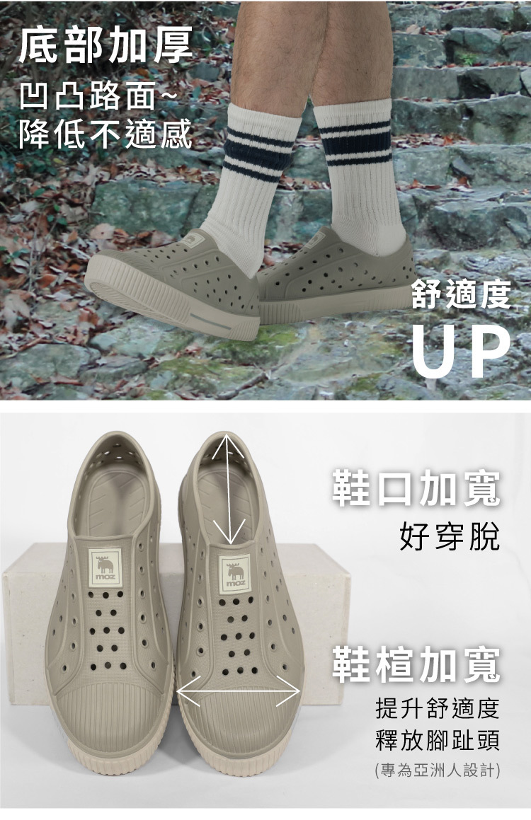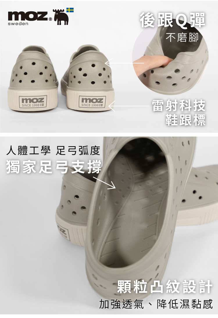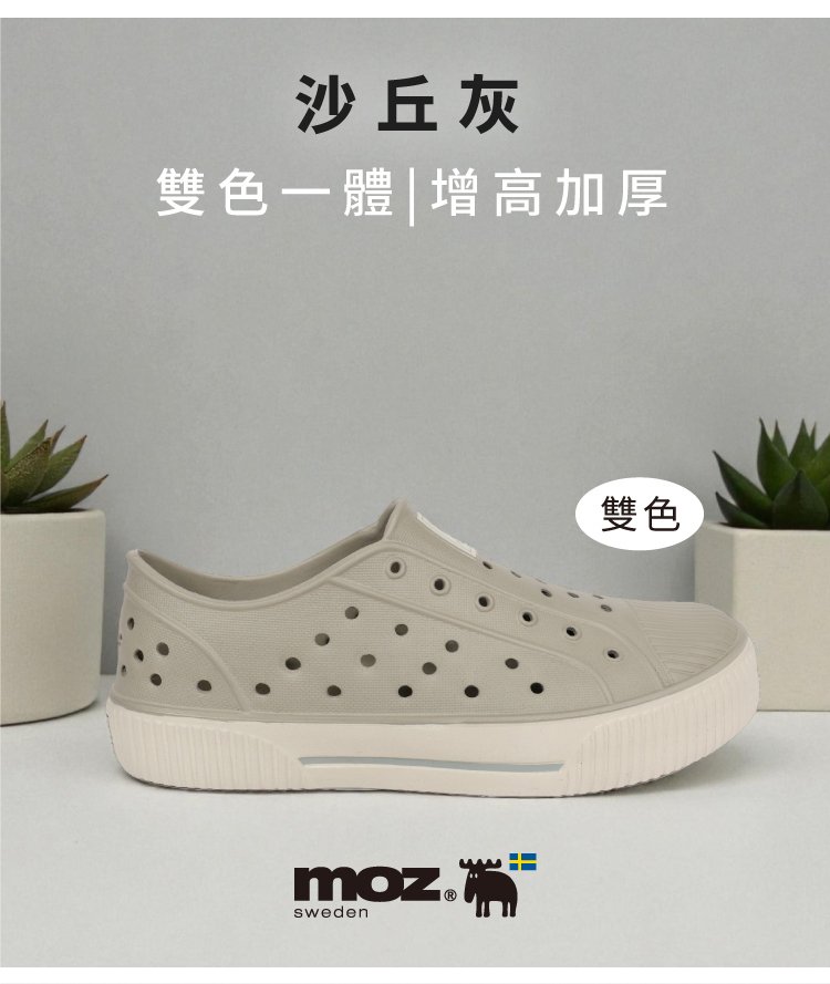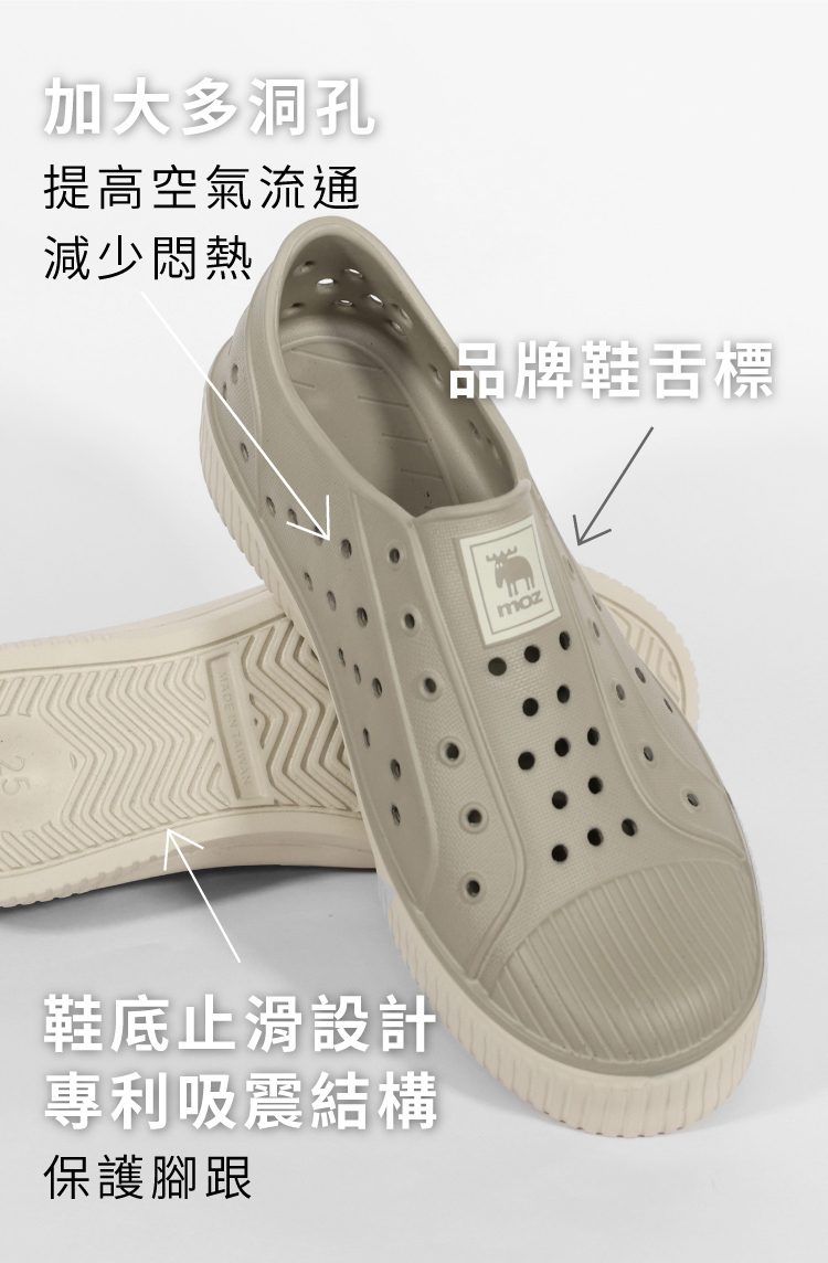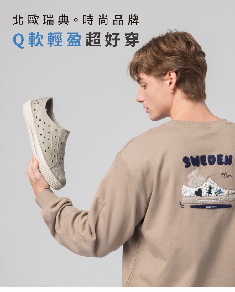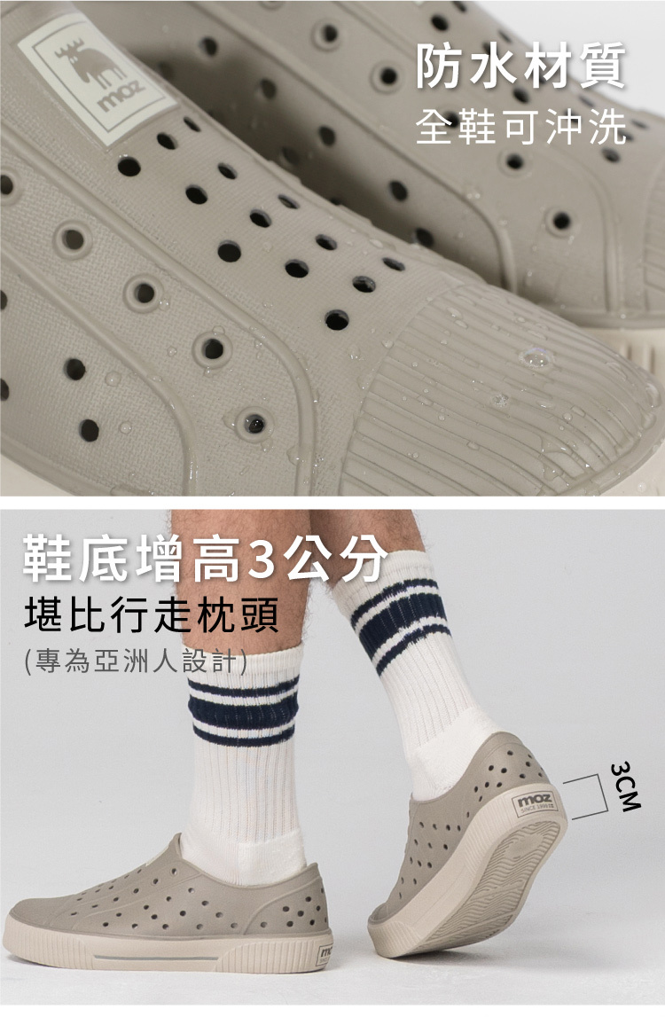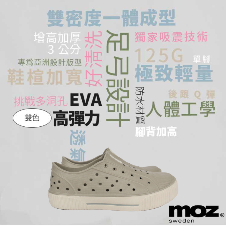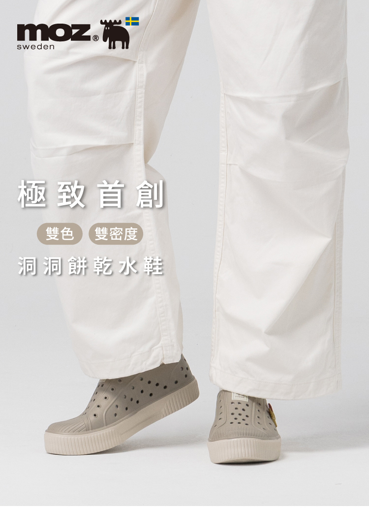 想找一雙既輕盈又舒適的洞洞水鞋?moz瑞典駝鹿全球首創「餅乾水鞋」,嚴選日本UBE無毒EVA原料,僅125g超輕量,就像一杯冰淇淋的重量。3cm增高設計拉長腿部比例,加寬鞋楦和Q彈後跟不磨腳,久站、久走都能安心舒適。加大透氣洞孔,夏天穿也涼爽不悶熱,適合日常外出或防水使用。