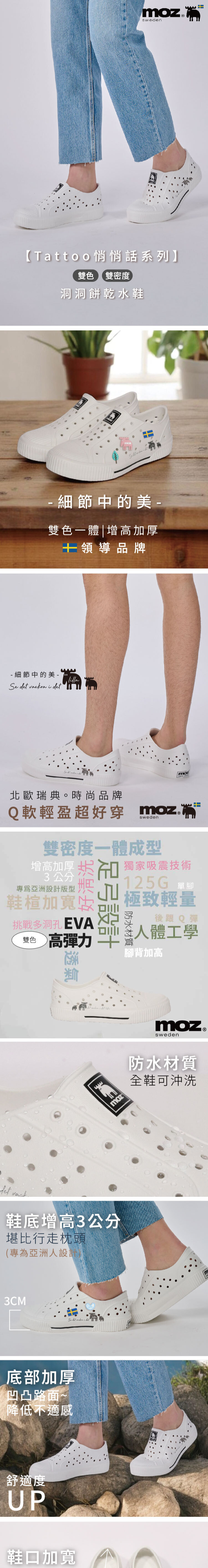 鞋底增厚3cm,同時具備Q彈柔軟設計,有效分散壓力、減少磨腳。 |
