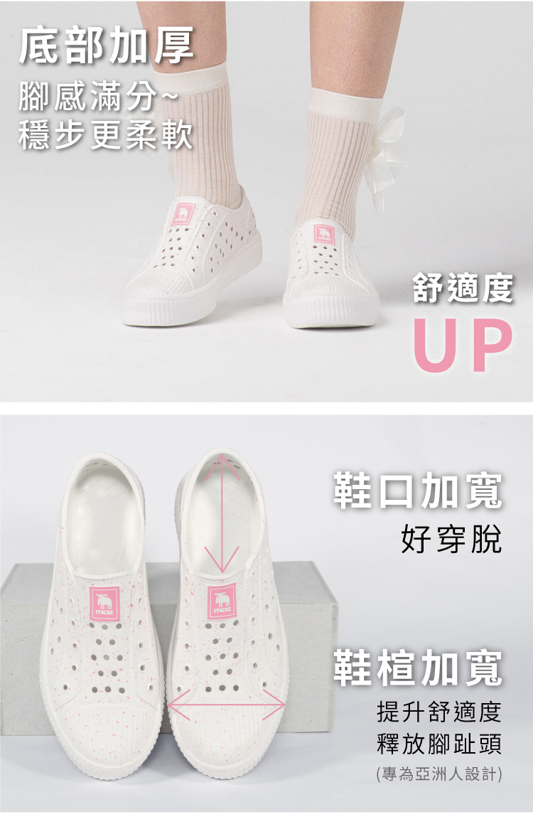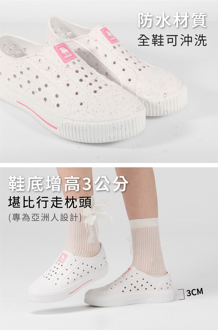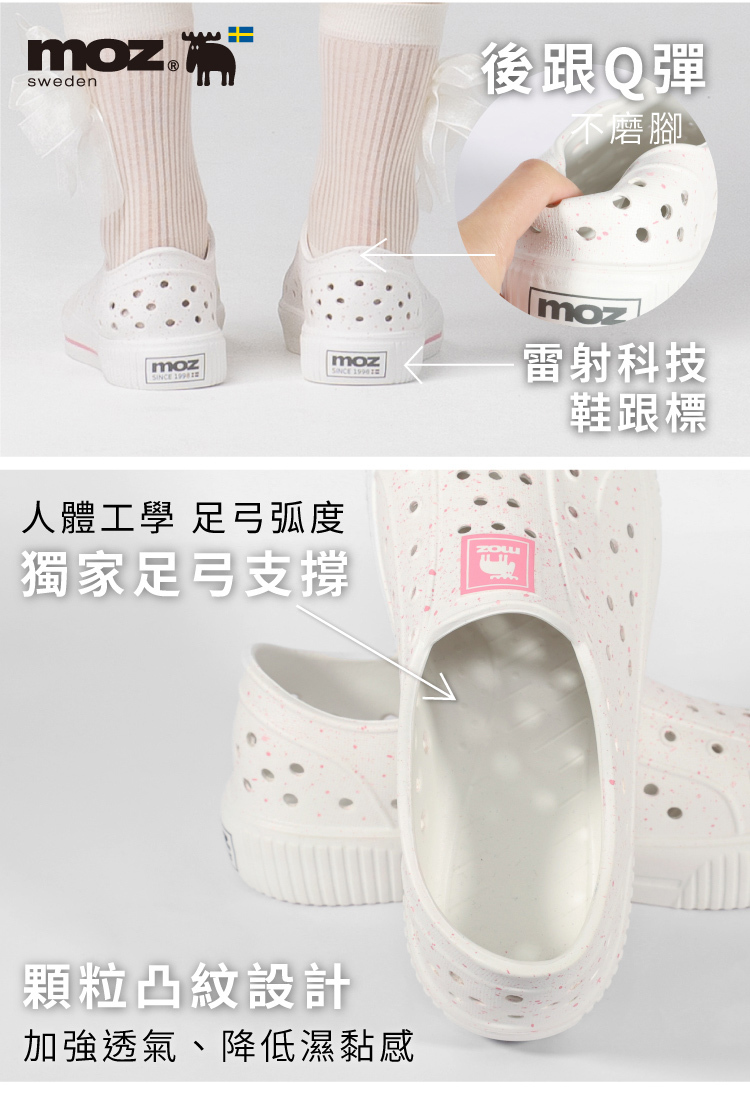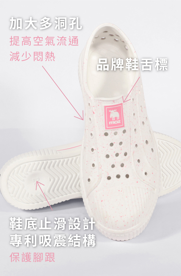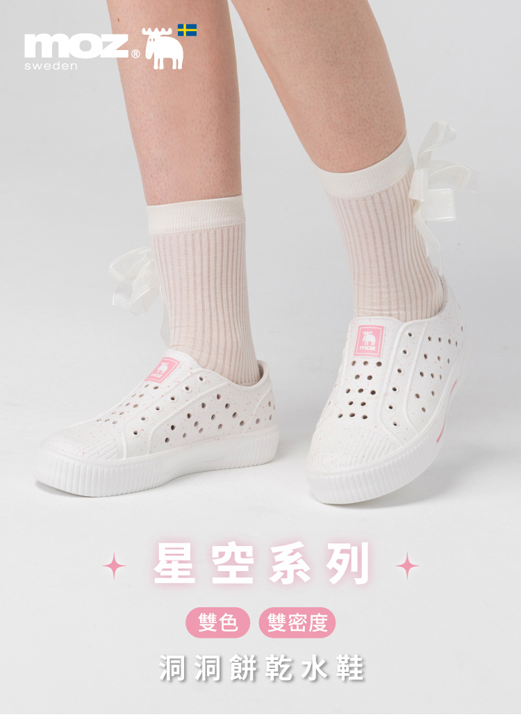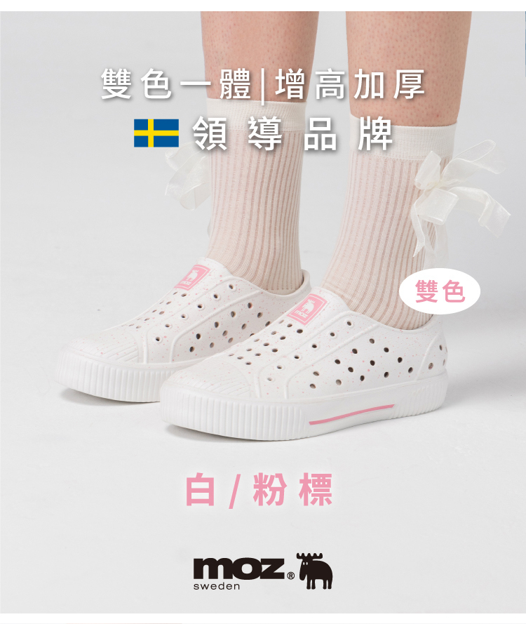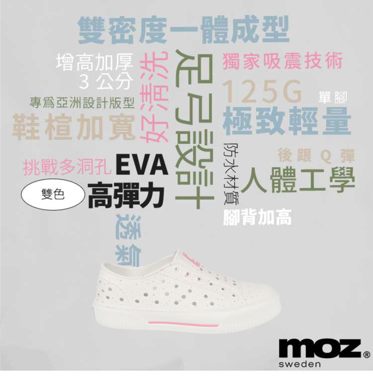 想找一雙既輕盈又舒適的洞洞水鞋?moz瑞典駝鹿全球首創「餅乾水鞋」,嚴選日本UBE無毒EVA原料,僅125g超輕量,就像一杯冰淇淋的重量。3cm增高設計拉長腿部比例,加寬鞋楦和Q彈後跟不磨腳,久站、久走都能安心舒適。加大透氣洞孔,夏天穿也涼爽不悶熱,適合日常外出或防水使用。