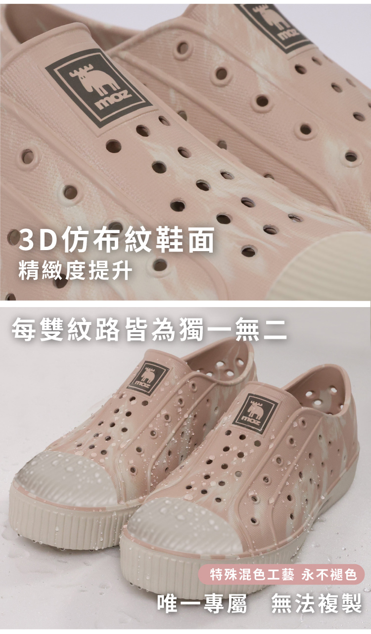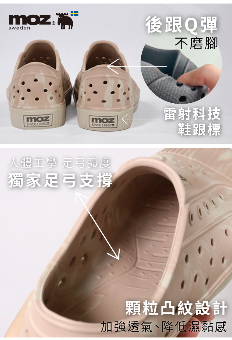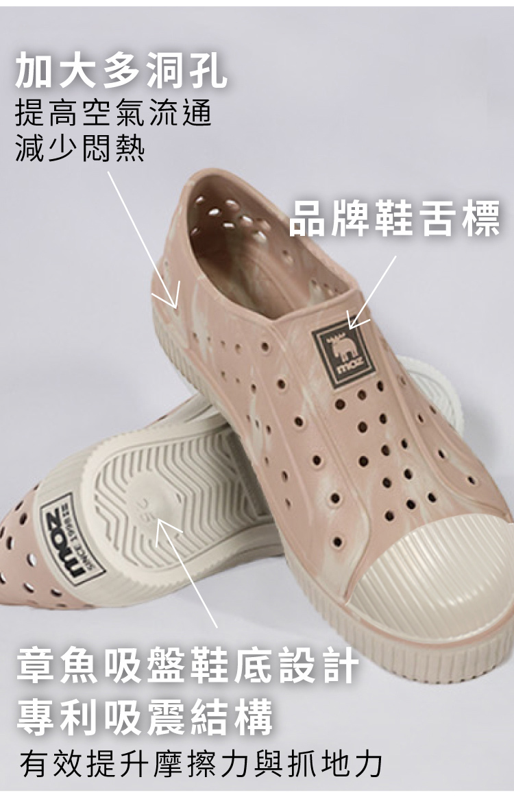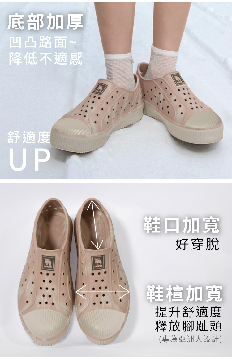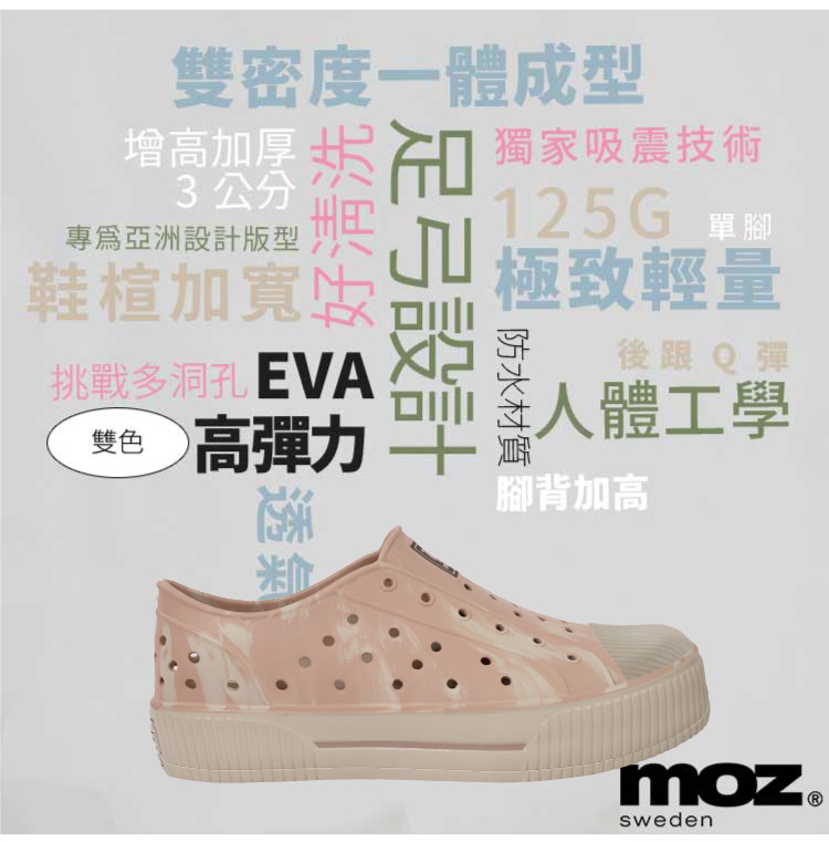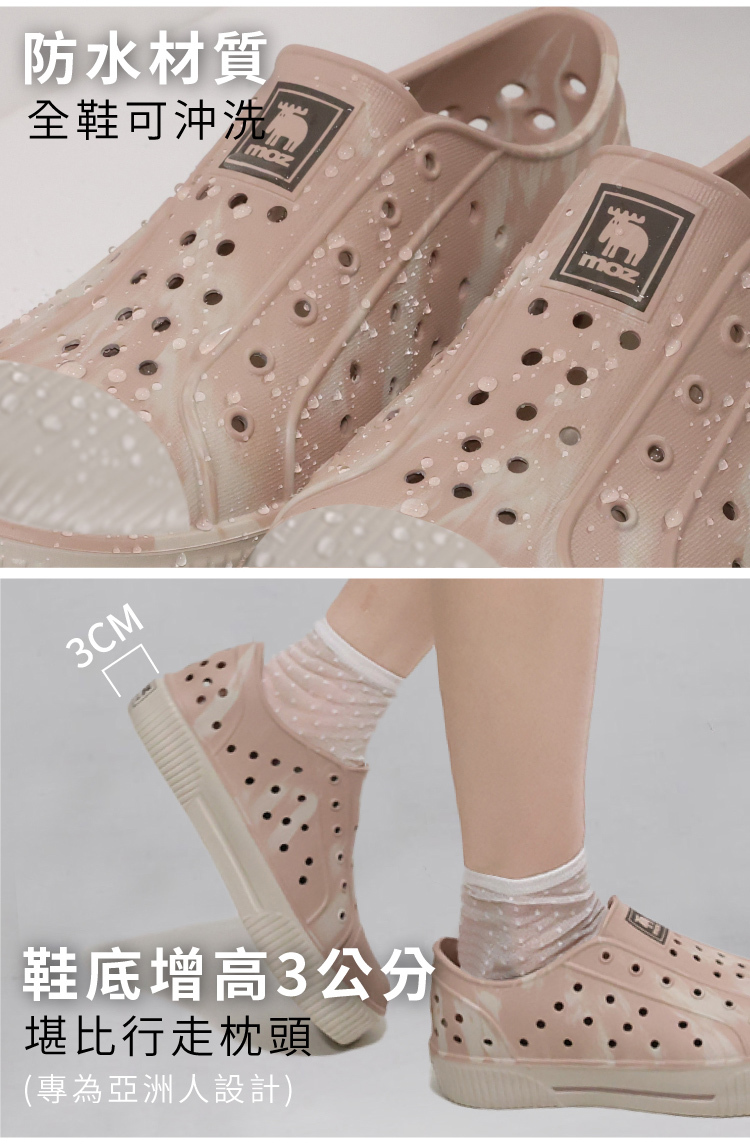 想找一雙既輕盈又舒適的洞洞水鞋?moz瑞典駝鹿全球首創「餅乾水鞋」,嚴選日本UBE無毒EVA原料,僅125g超輕量,就像一杯冰淇淋的重量。3cm增高設計拉長腿部比例,加寬鞋楦和Q彈後跟不磨腳,久站、久走都能安心舒適。加大透氣洞孔,夏天穿也涼爽不悶熱,適合日常外出或防水使用。