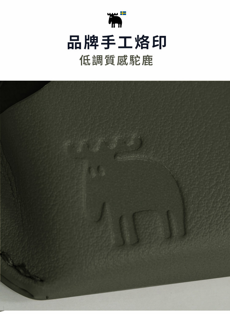 專屬品牌駝鹿 LOGO手工烙印於皮革,展現質感細節。